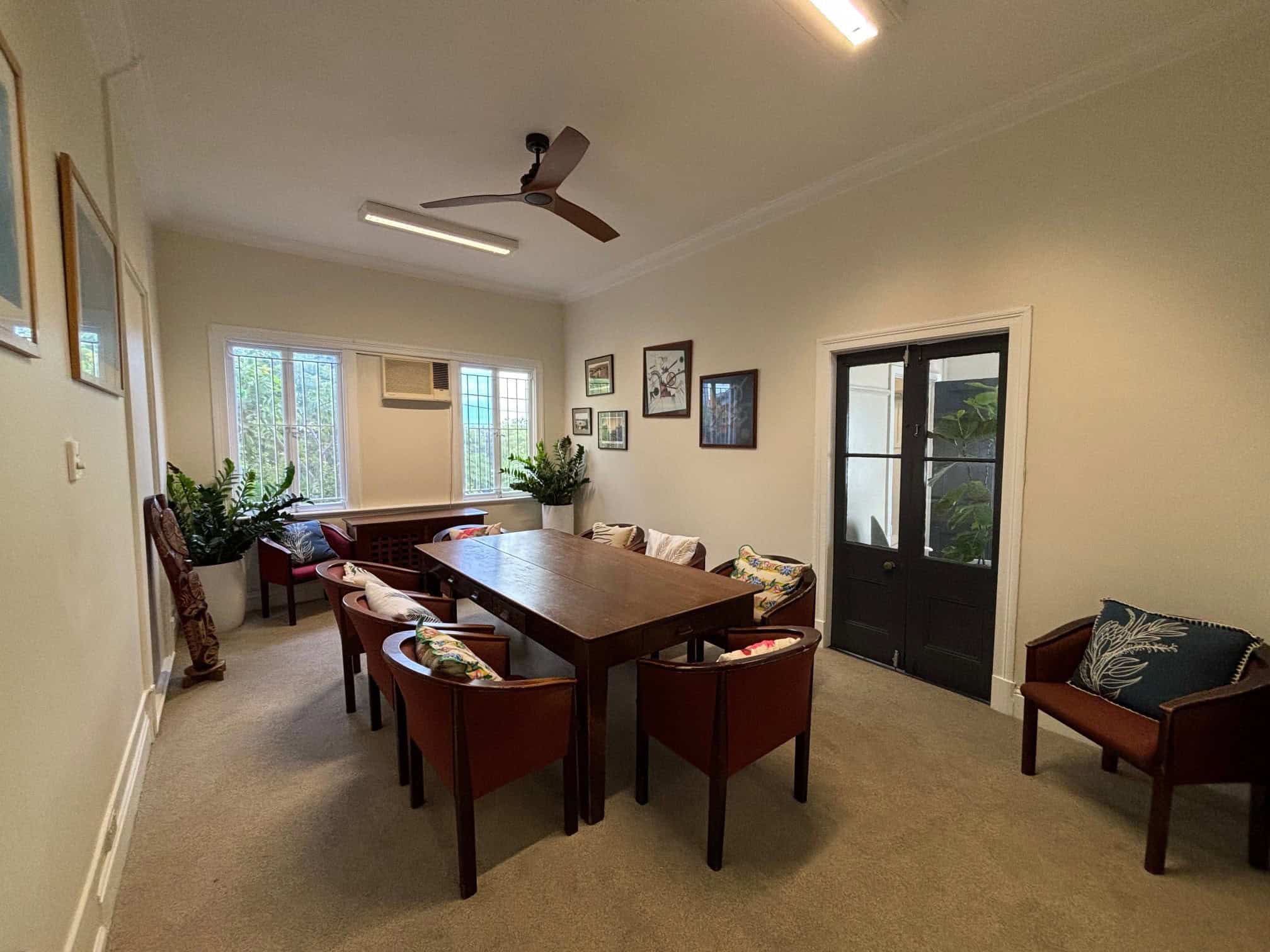 The EBCC Board Room is a professional and comfortable space, ideal for meetings, planning sessions, and workshops. It features a large conference table with seating, creating a focused environment for collaboration and conversation.